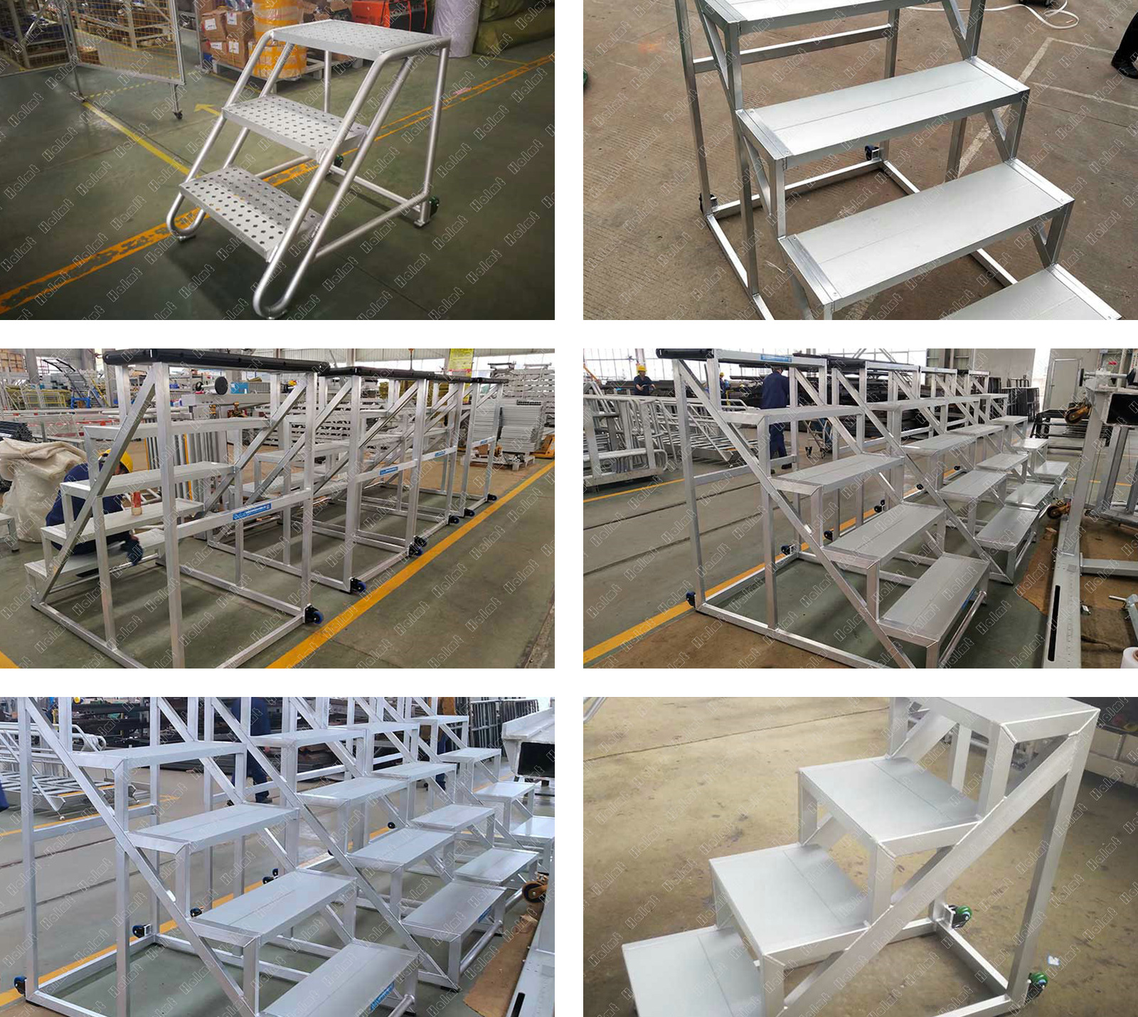 鋁合金踏步梯,支腿側配備兩滾輪,使用轉場快捷輕便。